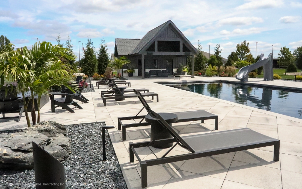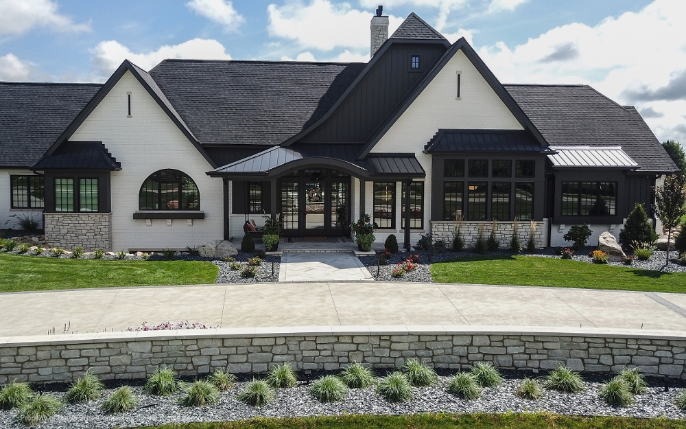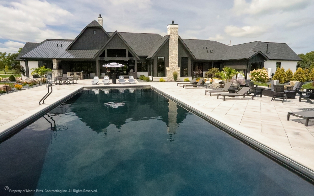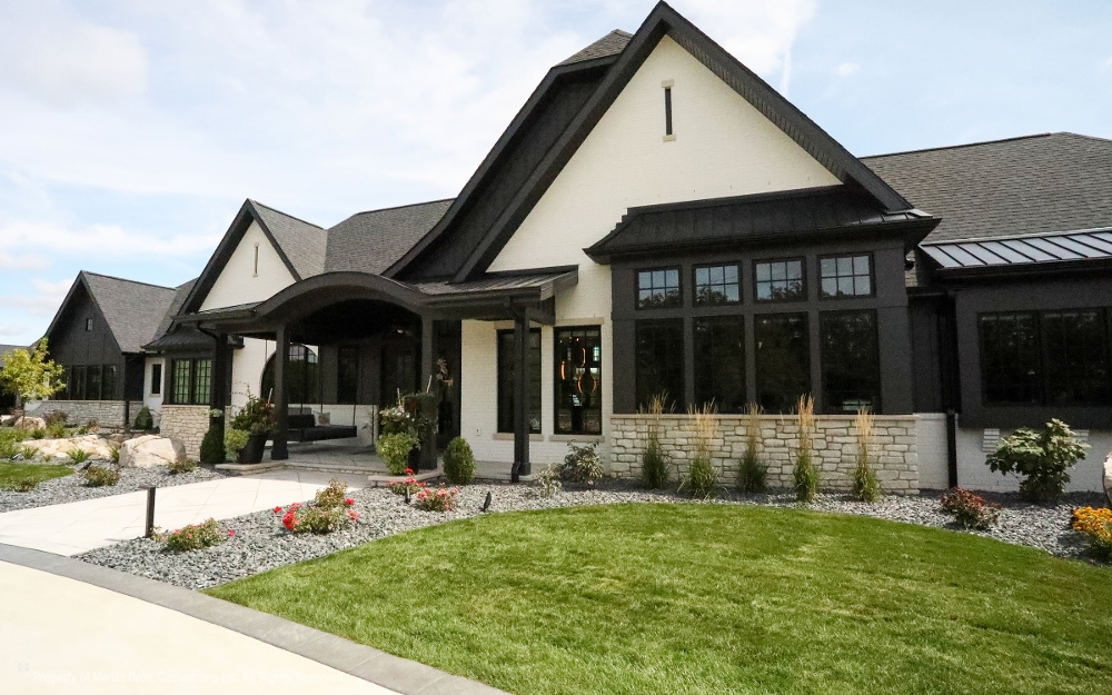 Stunning custom residence by Martin Bros. Contracting, Inc. blends a modern mission aesthetic with luxury detailing and exceptional outdoor living, featuring a high-contrast exterior of white painted brick, dark vertical siding, natural stone accents, black-trimmed windows, and a dark metal and shingle roof for striking curb appeal. The asymmetrical, multi-level design and expansive windows fill the home with natural light, while a welcoming covered entry with a curved metal roof accent adds architectural interest. The backyard serves as a private retreat with a spacious stone-paver patio designed for multiple gathering areas, anchored by a dark-bottom pool with a curved water slide, complemented by lounge seating, a fire pit, and a covered patio for outdoor dining. Thoughtful landscaping with decorative gravel, boulders, and layered plantings frames the property, creating a seamless blend of architecture, comfort, and craftsmanship.